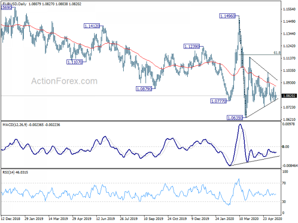Intraday bias in EUR/USD remains neutral as range trading consolidations. Corrective pattern from 1.0635 could extend further. On the upside, above 1.0895 minor resistance will turn bias to the upside for 1.1019 resistance. But overall, upside should be limited by 61.8% retracement of 1.1496 to 1.0635 at 1.1167. On the downside, break of 1.0727 will target a test on 1.0635 low.