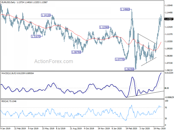 In the bigger picture, as long as 1.1496 resistance holds, whole down trend from 1.2555 (2018 high) should still be in progress. Next target is 1.0339 (2017 low). However, sustained break of 1.1496 will argue that such down trend has completed. Rise from 1.0635 could then be seen as the third leg of the pattern from 1.0339. In this case, outlook will be turned bullish for retesting 1.2555.