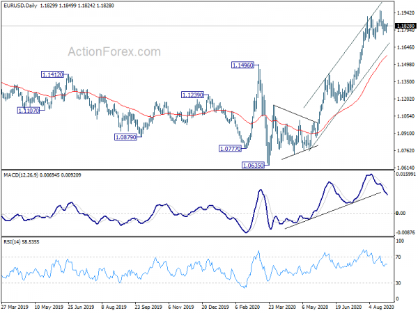Intraday bias in EUR/USD remains neutral as range trading continues. As long as 1.1711 support holds, further rise is mildly in favor. On the upside, break of 1.1965 will extend the whole rise from 1.0635. However, considering bearish divergence condition in 4 hour MACD, break of 1.1711 should confirm short term topping. Intraday bias will be turned back to the downside for 55 day EMA (now at 1.1581).