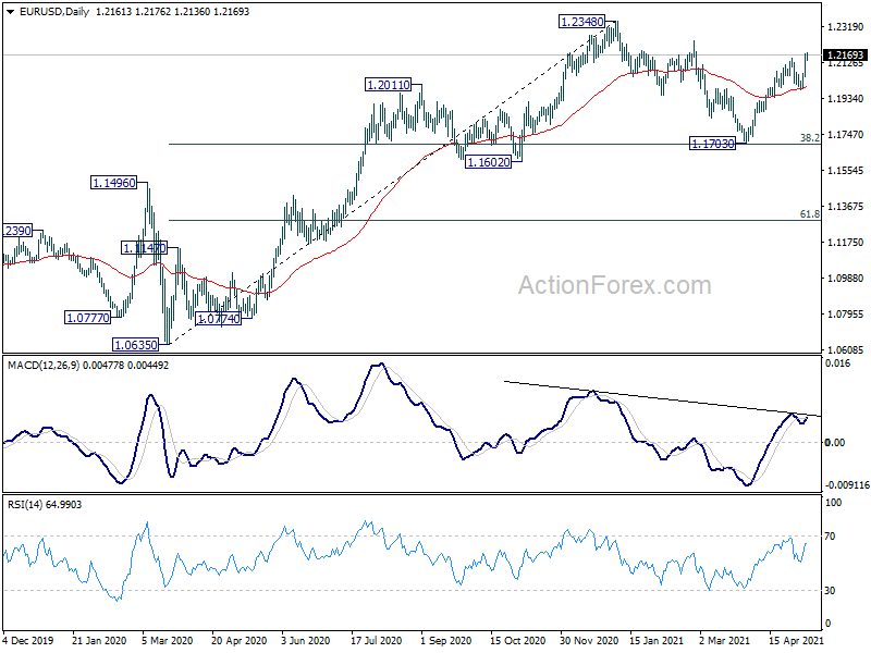 Intraday bias in EUR/USD stays on the upside at this point. Rise from 1.1703 should now target a test on 1.2242/2348 resistance zone. Decisive break there will resume larger up trend for 1.2555 key resistance zone next. On the downside, break of 1.1985 support is needed to indicate completion of the rally from 1.1703. Otherwise, outlook will remain cautiously bullish in case of retreat.