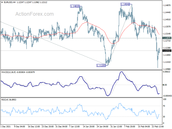 EUR/USD recovered after hitting 1.1105 but further fall is still expected with 1.1287 support turned resistance intact. Sustained break of 1.1120 will confirm resumption of larger down trend from 1.2348. Next target is 61.8% projection of 1.2265 to 1.1120 from 1.1494 at 1.0786. However, firm break of 1.1287 will dampen this bearish view and turn bias back to the upside for 1.1494 resistance.