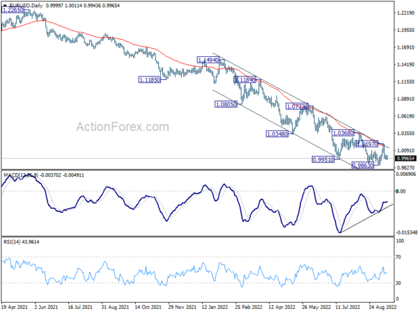 No change in EUR/USD’s outlook and intraday bias stays mildly mildly on the downside for retesting 0.9863 low. Firm break there will resume larger down trend. On the upside, break of 1.0197 resistance will now raise the chance of larger trend reversal, and target 1.0368 resistance.
