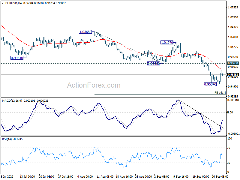 Intraday bias in EUR/USD is turned neutral again with current recovery. Some consolidations could be seen but upside should be limited by 0.9863 support turned resistance to bring fall resumption. Break of 0.9534 will resume larger down trend, and target 161.8% projection of 1.0368 to 0.9863 from 1.0197 at 0.9380 next.