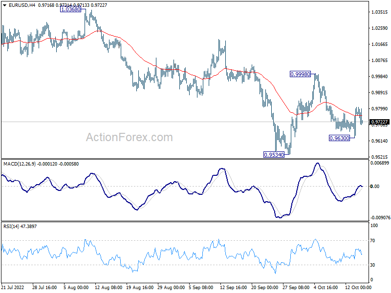 EUR/USD stayed in sideway pattern from 0.9534 last week and outlook is unchanged. Initial bias stays neutral this week and deeper decline is expected with 0.9998 resistance intact. Below 0.9630 will bring retest of 0.9534 low first. Firm break there will resume larger down trend.