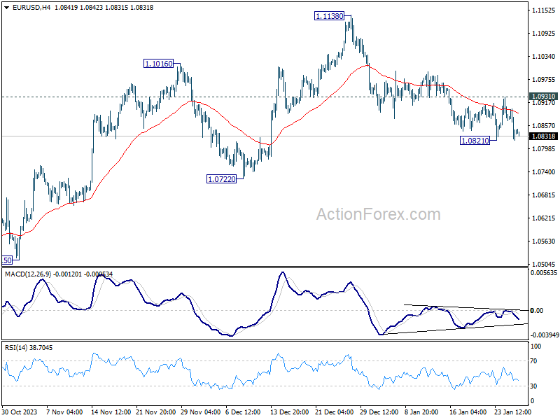 Intraday bias in EUR/USD remains neutral at this point, as range trading continues above 1.0821 temporary low. On the downside, break of 1.0821 will resume the fall from 1.1138 to 1.0722 support. On the upside, above 1.0931 will resume the rebound from 1.0821 towards 1.1138 resistance.