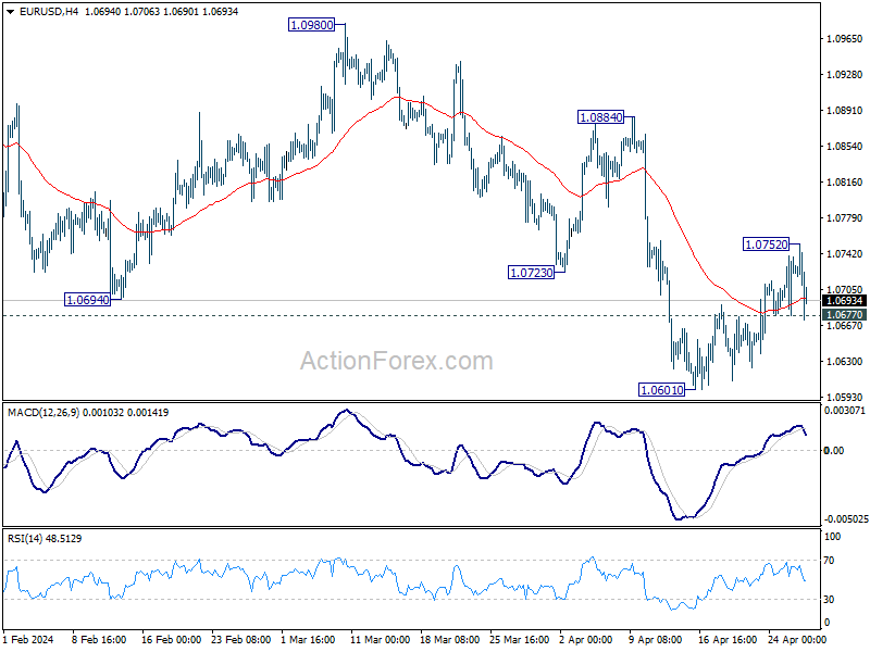 EUR/USD recovered further to 1.0752 last week but retreated since then. Initial bias is turned neutral this week first. On the upside, above 1.0752 will resume the rebound to 55 D EMA (now at 1.0780). On the downside, break of 1.0677 minor support will turn intraday bias to the downside for retesting 1.0601 low.