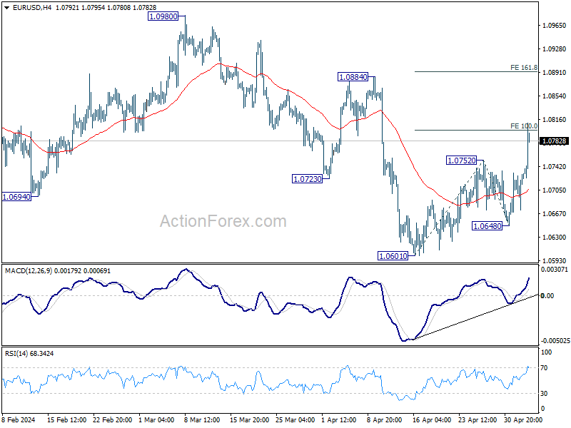 EUR/USD’s rebound from 1.0601 resumed by breaking through 1.0752 and intraday bias back on the upside. Strong break of 55 D EMA suggests that fall from 1.0980 has completed with three waves down to 1.0601. Further rally is expected and firm break of 100% projection of 1.0601 to 1.0752 from 1.0648 at 1.0799 will pave the way to 161.8% projection at 1.0892. For now, risk will stay on the upside as long as 1.0648 support holds, in case of retreat.