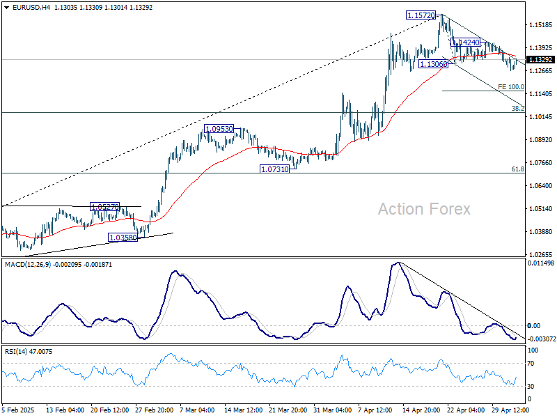 EUR/USD’s corrective fall from 1.1572 could extend lower to 100% projection of 1.1572 to 1.1306 from 1.1424 at 1.1158. But downside should be contained by 38.2% retracement of 1.0176 to 1.1572 at 1.1039 to complete the correction. On the upside, break of 1.1424 will bring retest of 1.1572 high first.