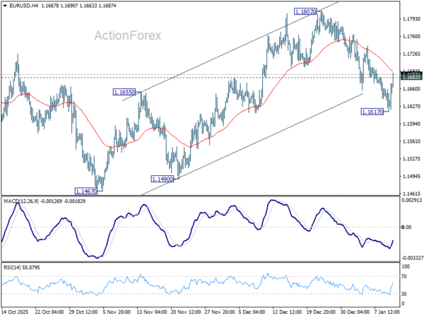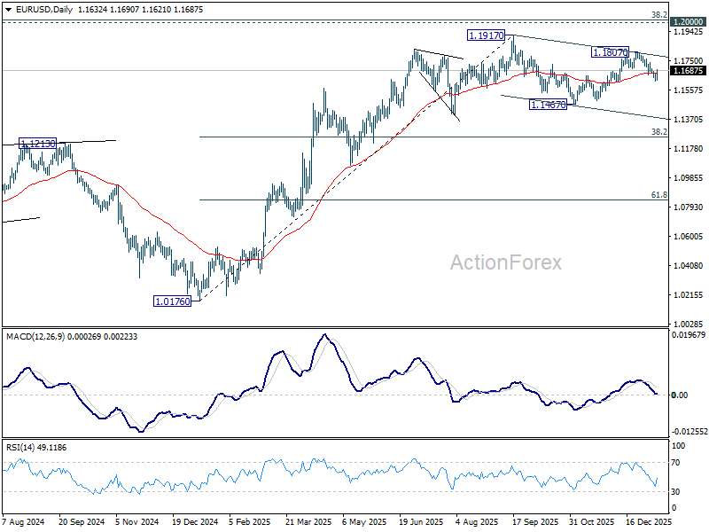 Intraday bias in EUR/USD is turned neutral with current recovery. On the upside, break of 1.1807 will resume the rally from 1.1467 to retest 1.1917 high. On the downside, below 1.1617 will target 1.1467 support. Overall, price actions from 1.1917 are seen as a corrective pattern that might extend further.
