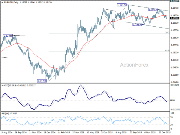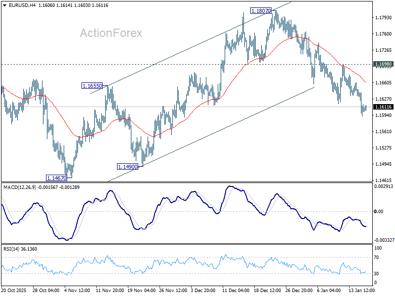 Intraday bias in EUR/USD remains on the downside for the moment, as fall from 1.1807 is extending. The decline is seen as the third leg of the corrective pattern from 1.1917, and should target 1.1467 support and below. Risk will now stay on the downside as long as 1.1698 resistance holds, in case of recovery.