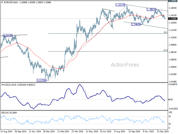 EUR/USD’s fall from 1.1807 continued last week and the development solidifies that it’s in the third leg of the corrective pattern from 1.1917. Initial bias stays on the downside this week for 1.1467 and below. For now, risk will stay on the downside as long as 1.1698 resistance hods, in case of recovery.