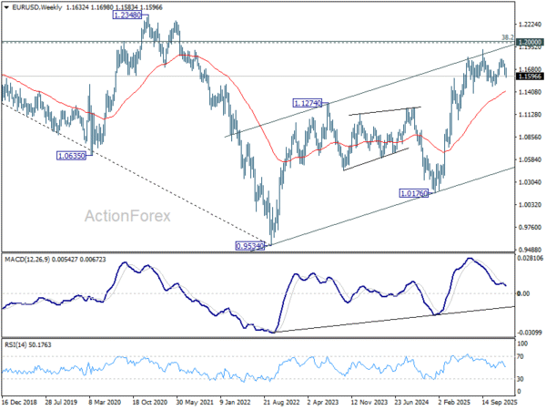 In the bigger picture, as long as 55 W EMA (now at 1.1413) holds, up trend from 0.9534 (2022 low) is still in favor to continue. Decisive break of 1.2 key psychological level will carry larger bullish implication. However, sustained trading below 55 W EMA will argue that rise from 0.9534 has completed as a three wave corrective bounce, and keep long term outlook bearish.