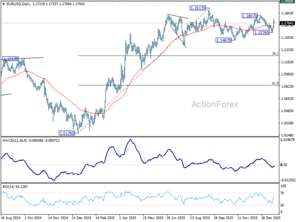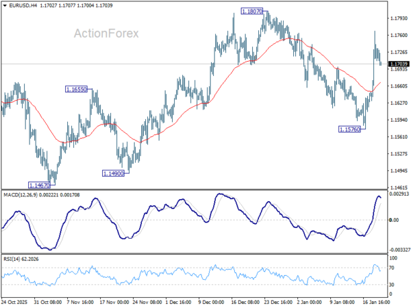 EUR/USD’s rise from 1.1576 should still be in progress and intraday bias remains on the upside for 1.1807. Firm break there will resume whole rally from 1.1467, and target a retest on 1.1917 key resistance level. For now, risk will stay on the upside as long as 55 4H EMA (now at 1.1666) holds, in case of retreat.