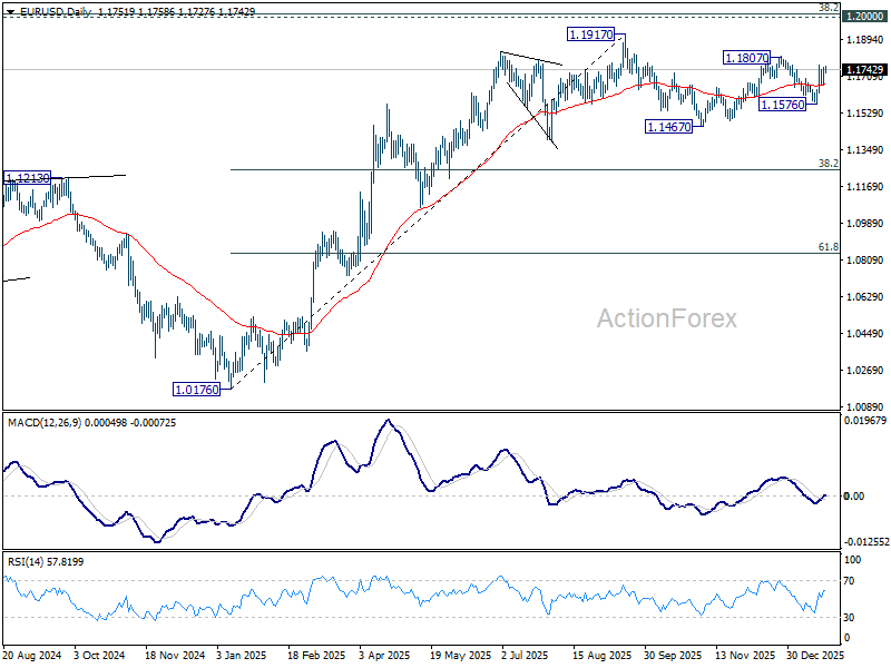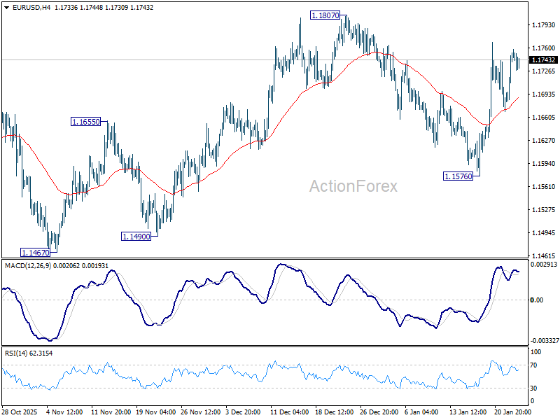 Intraday bias in EUR/USD stays neutral and outlook is unchanged. Risk stays on the upside with 55 4H EMA (now at 1.1689) intact. Break of 1.1807 will resume whole rally from 1.1467, and target a retest on 1.1917 key resistance level. However, sustained trading below 55 4H EMA will bring deeper fall back to 1.1576 support instead.
