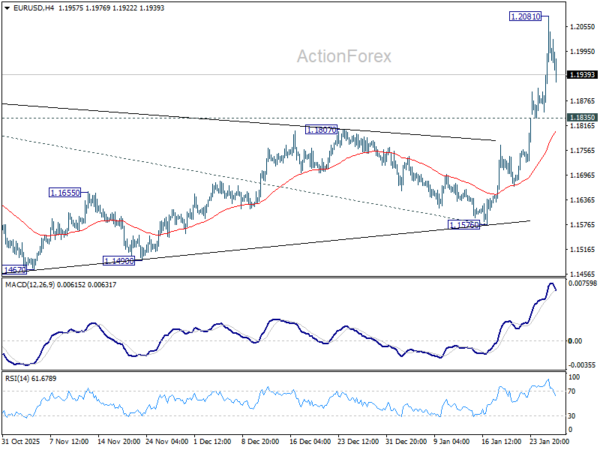 A temporary top is formed at 1.2081 in EUR/USD with current retreat. Intraday bias is turned neutral for consolidations. Downside should be contained by 1.1835 support. Decisive break above 1.2 will carry larger bullish implications. Next near term target will be 38.2% projection of 1.0176 to 1.1917 from 1.1576 at 1.3434. However, break of 1.1835 will indicate short term topping, and turn bias to the downside for deeper pullback.