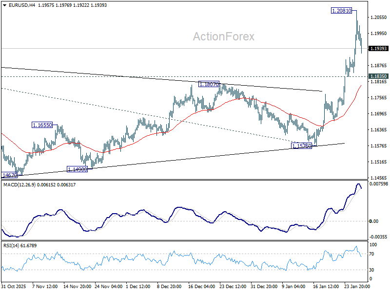 A temporary top is formed at 1.2081 in EUR/USD with current retreat. Intraday bias is turned neutral for consolidations. Downside should be contained by 1.1835 support. Decisive break above 1.2 will carry larger bullish implications. Next near term target will be 38.2% projection of 1.0176 to 1.1917 from 1.1576 at 1.3434. However, break of 1.1835 will indicate short term topping, and turn bias to the downside for deeper pullback.