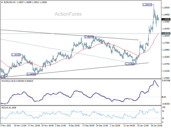 EUR/USD is staying in consolidations below 1.2081 and intraday bias remains neutral. Downside should be contained by 1.1835 support. Decisive break above 1.2 will carry larger bullish implications. Next near term target will be 38.2% projection of 1.0176 to 1.1917 from 1.1576 at 1.3434. However, break of 1.1835 will indicate short term topping, and turn bias to the downside for deeper pullback.