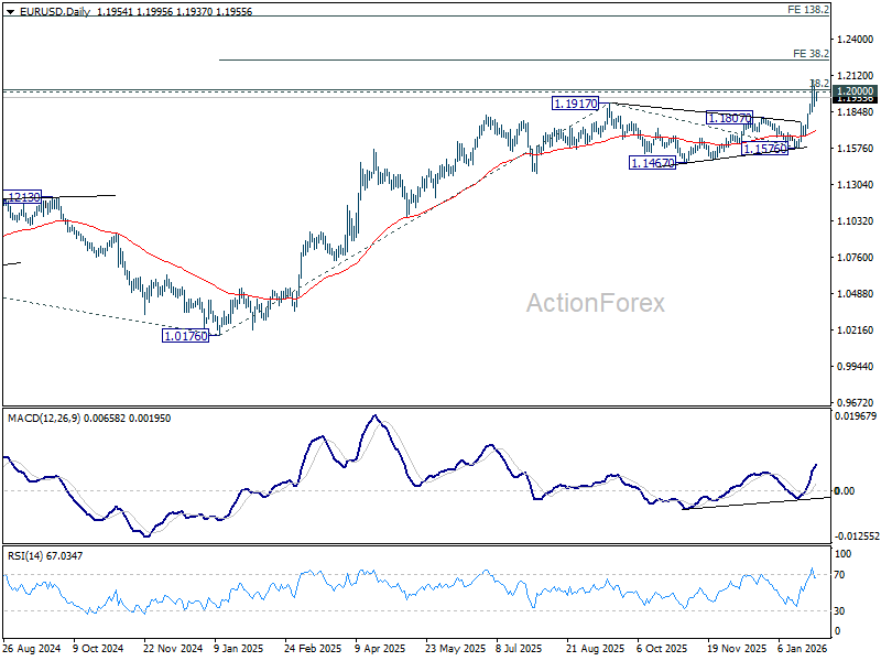 In the bigger picture, as long as 55 W EMA (now at 1.1443) holds, up trend from 0.9534 (2022 low) is still in favor to continue. Decisive break of 1.2 key psychological level will add to the case of long term bullish trend reversal. Next medium term target will be 138.2% projection of 0.9534 to 1.1274 from 1.0176 at 1.2581. However, sustained trading below 55 W EMA will argue that rise from 0.9534 has completed as a three wave corrective bounce, and keep long term outlook bearish.