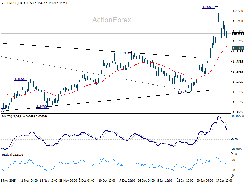 Intraday bias in EUR/USD remains neutral and more consolidations could be seen below 1.2081. But downside of retreat should be contained by 1.1835 support. Decisive break above 1.2 will carry larger bullish implications. Next near term target will be 38.2% projection of 1.0176 to 1.1917 from 1.1576 at 1.3434. However, break of 1.1835 will indicate short term topping, and turn bias to the downside for deeper pullback.