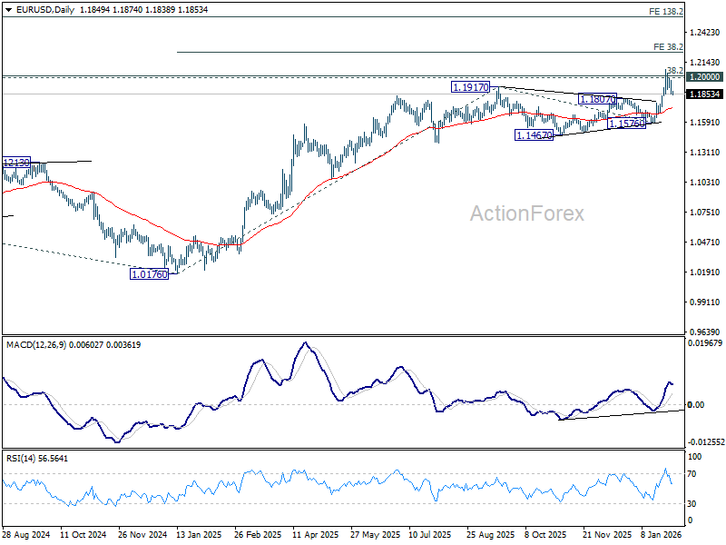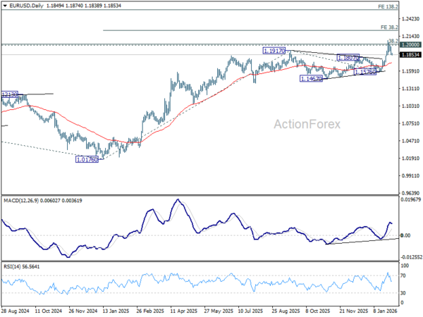 Intraday bias in EUR/USD stays neutral and more consolidations would be seen. Downside of retreat should be contained by 1.1835 support. Decisive break above 1.2 will carry larger bullish implications. Next near term target will be 38.2% projection of 1.0176 to 1.1917 from 1.1576 at 1.3434. However, break of 1.1835 will indicate short term topping, and turn bias to the downside for deeper pullback.