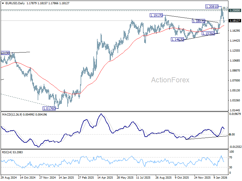 Intraday bias in EUR/USD remains mildly on the downside at this point. Fall from 1.2081 short term top would target 55 D EMA (now at 1.1721). Firm break there will raise the chance of reversal on rejection by 1.2 psychological level, and target 1.1576 support. On the upside, above 1.1893 minor resistance will turn bias neutral. Decisive break above 1.2 will carry larger bullish implications.