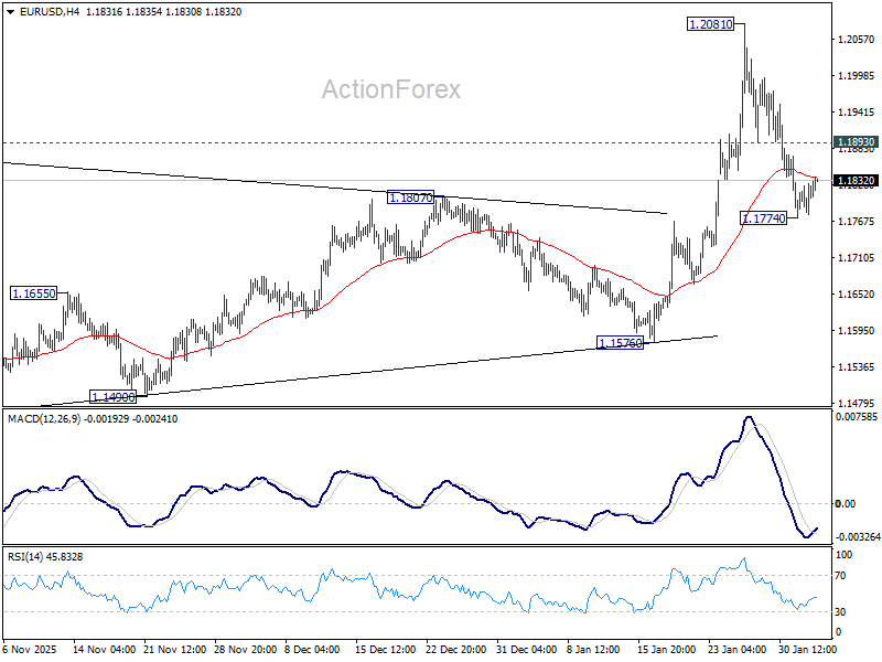 Intraday bias in EUR/USD is turned neutral with current recovery. Below 1.1774 will extend the fall from 1.2081 short term top to 55 D EMA (now at 1.1724). Firm break there will raise the chance of reversal on rejection by 1.2 psychological level, and target 1.1576 support. On the upside, above 1.1893 minor resistance will bring stronger rebound to retest 1.2081. Decisive break above 1.2 will carry larger bullish implications.