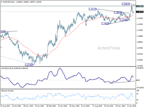 In the bigger picture, as long as 55 W EMA (now at 1.1458) holds, up trend from 0.9534 (2022 low) is still in favor to continue. Decisive break of 1.2 key psychological level will add to the case of long term bullish trend reversal. Next medium term target will be 138.2% projection of 0.9534 to 1.1274 from 1.0176 at 1.2581. However, sustained trading below 55 W EMA will argue that rise from 0.9534 has completed as a three wave corrective bounce, and keep long term outlook bearish.