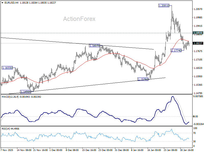 Intraday bias in EUR/USD remains neutral as it’s bounded in right range above 1.1774. On the downside, below 1.1774 will extend the fall from 1.2081 short term top to 55 D EMA (now at 1.1724). Firm break there will raise the chance of reversal on rejection by 1.2 psychological level, and target 1.1576 support. On the upside, above 1.1893 minor resistance will bring stronger rebound to retest 1.2081. Decisive break above 1.2 will carry larger bullish implications.