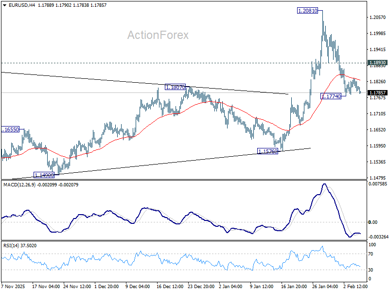 Intraday bias in EUR/USD remains neutral for the moment. On the downside, below 1.1774 will extend the fall from 1.2081 short term top to 55 D EMA (now at 1.1724). Firm break there will raise the chance of reversal on rejection by 1.2 psychological level, and target 1.1576 support. On the upside, above 1.1893 minor resistance will bring stronger rebound to retest 1.2081. Decisive break above 1.2 will carry larger bullish implications.