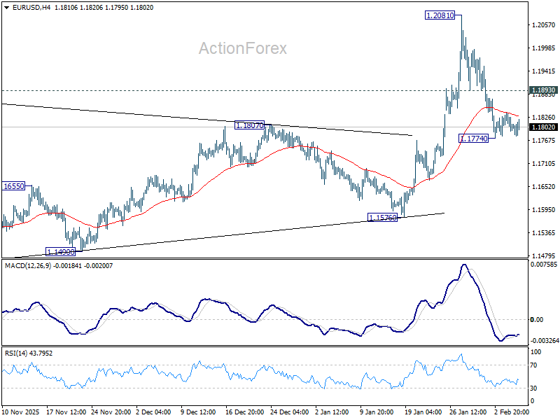 EUR/USD is still gyrating in tight range and intraday bias remains neutral. On the downside, below 1.1774 will extend the fall from 1.2081 short term top to 55 D EMA (now at 1.1724). Firm break there will raise the chance of reversal on rejection by 1.2 psychological level, and target 1.1576 support. On the upside, above 1.1893 minor resistance will bring stronger rebound to retest 1.2081. Decisive break above 1.2 will carry larger bullish implications.