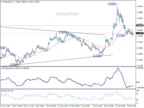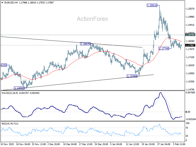 Intraday bias in EUR/USD is mildly on the downside with breach of 1.1774 temporary low. Sustained trading below 55 D EMA (now at 1.1731) will raise the chance of reversal on rejection by 1.2 psychological level, and target 1.1576 support. On the upside, above 1.1870 minor resistance will bring stronger rebound to retest 1.2081. Decisive break above 1.2 will carry larger bullish implications.
