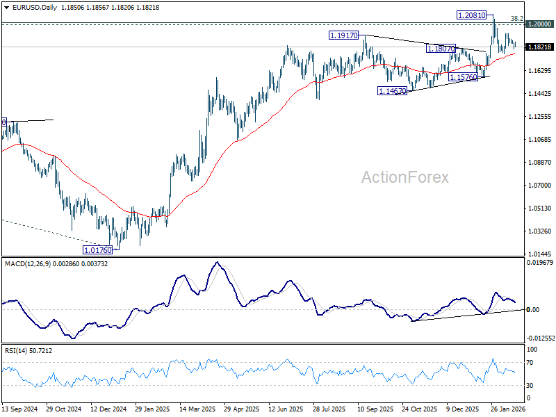 EUR/USD is still bounded in range trading and intraday bias stays neutral. On the upside, above 1.1928 will target a retest on 1.2081 high. Decisive break there and sustained trading above 1.2 psychological level will carry larger bullish implications. On the downside, however, sustained trading below 55 D EMA (now at 1.1763) will raise the chance of reversal on rejection by 1.2, and target 1.1576 support for confirmation.
