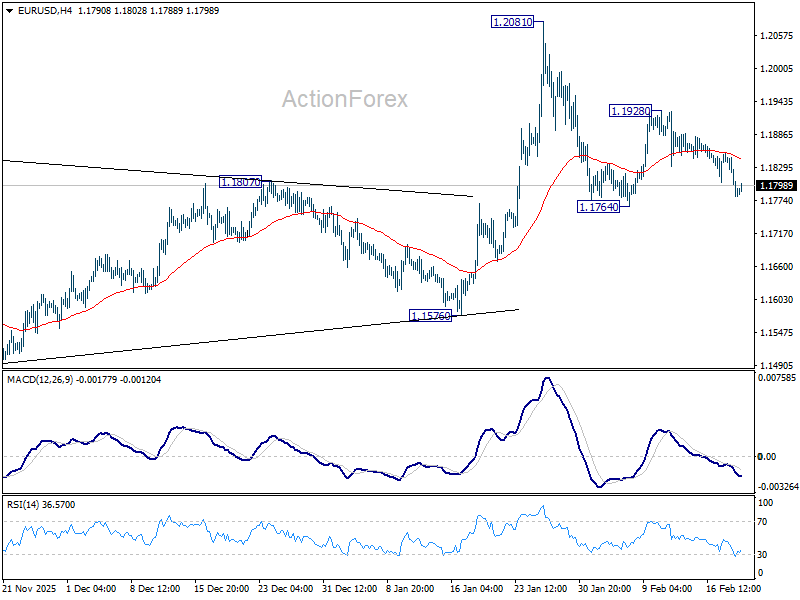 Focus is back on 1.1764 in EUR/USD with today’s decline. Firm break there will resume the fall from 1.2081. Also, sustained trading below 55 D EMA (now at 1.1763) will raise the chance of reversal on rejection by 1.2, and target 1.1576 support for confirmation. On the upside, though, break of 1.1928 will bring stronger rise to retest 1.2081 high.