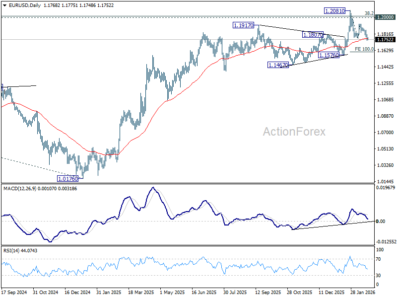 Intraday bias in EUR/USD remains on the downside as fall from 1.2081 continues today. Sustained trading below 55 D EMA (now at 1.1763) will raise the chance of reversal on rejection by 1.2, and target 1.1576 support for confirmation. For now, risk will stay mildly on the downside as long as 1.1928 resistance holds, in case of recovery.