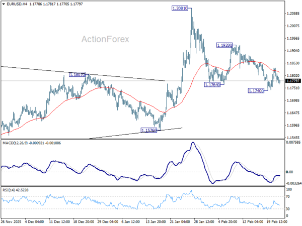 Intraday bias in EUR/USD remains neutral for the moment. Near term risk will remain on the downside as long as 1.1928 resistance holds. Below 1.1740 temporary low will target 1.1576 support next. Firm break there should confirm rejection by 1.2 key psychological level and turn near term outlook bearish.