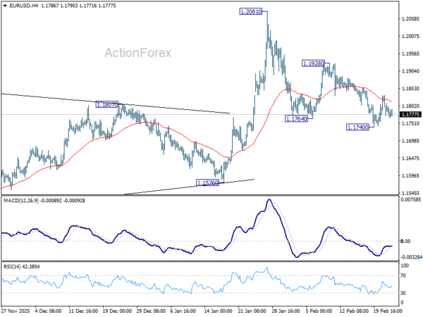 EUR/USD is staying in consolidations above 1.1740 and intraday bias remains neutral. Near term risk will remain on the downside as long as 1.1928 resistance holds. Below 1.1740 temporary low will target 1.1576 support next. Firm break there should confirm rejection by 1.2 key psychological level and turn near term outlook bearish. However, break of 1.1928 argue that fall from 1.2081 has completed as a correction, and revive near term bullishness. Retest of 1.2081 should then be seen next.