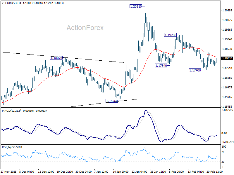Intraday bias in EUR/USD remains neutral for the moment, as range trading continues. Near term risk will remain on the downside as long as 1.1928 resistance holds. Below 1.1740 temporary low will target 1.1576 support next. Firm break there should confirm rejection by 1.2 key psychological level and turn near term outlook bearish. However, break of 1.1928 argue that fall from 1.2081 has completed as a correction, and revive near term bullishness. Retest of 1.2081 should then be seen next.
