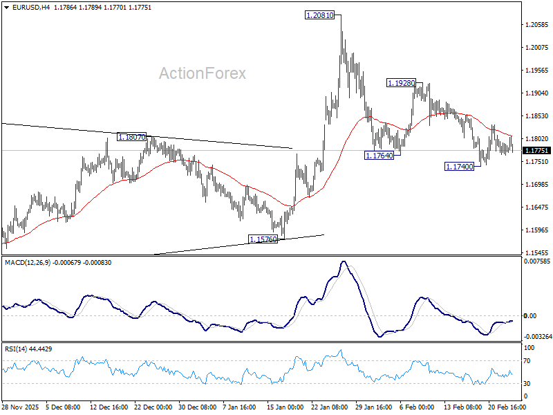 Range trading continues in EUR/USD and intraday bias stays neutral. Near term risk will remain on the downside as long as 1.1928 resistance holds. Below 1.1740 temporary low will target 1.1576 support next. Firm break there should confirm rejection by 1.2 key psychological level and turn near term outlook bearish. However, break of 1.1928 argue that fall from 1.2081 has completed as a correction, and revive near term bullishness. Retest of 1.2081 should then be seen next.