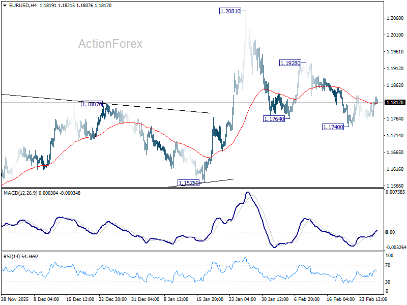 No change in EUR/USD’s outlook and intraday bias stays neutral at this point. Near term risk will remain on the downside as long as 1.1928 resistance holds. Below 1.1740 temporary low will target 1.1576 support next. Firm break there should confirm rejection by 1.2 key psychological level and turn near term outlook bearish. However, break of 1.1928 argue that fall from 1.2081 has completed as a correction, and revive near term bullishness. Retest of 1.2081 should then be seen next.