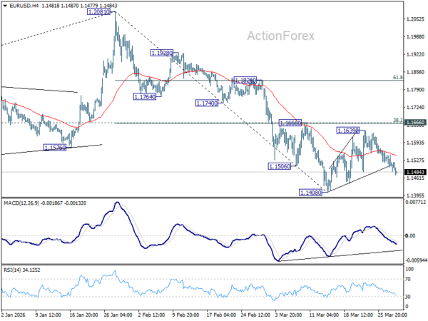 EUR/USD is still staying around mid-point of established range above 1.1408 and intraday bias remains neutral. Further decline is expected with 1.1666 cluster resistance (38.2% retracement of 1.2081 to 1.1408 at 1.1665) intact. On the downside, firm break of 1.1408 will resume the fall from 1.2081 to 38.2% retracement of 1.0176 to 1.2081 at 1.1353. However, decisive break of 1.1666 will argue that the fall from 1.2081 has completed, and turn bias back to the upside for 61.8% retracement of 1.2081 to 1.1408 at 1.1824.