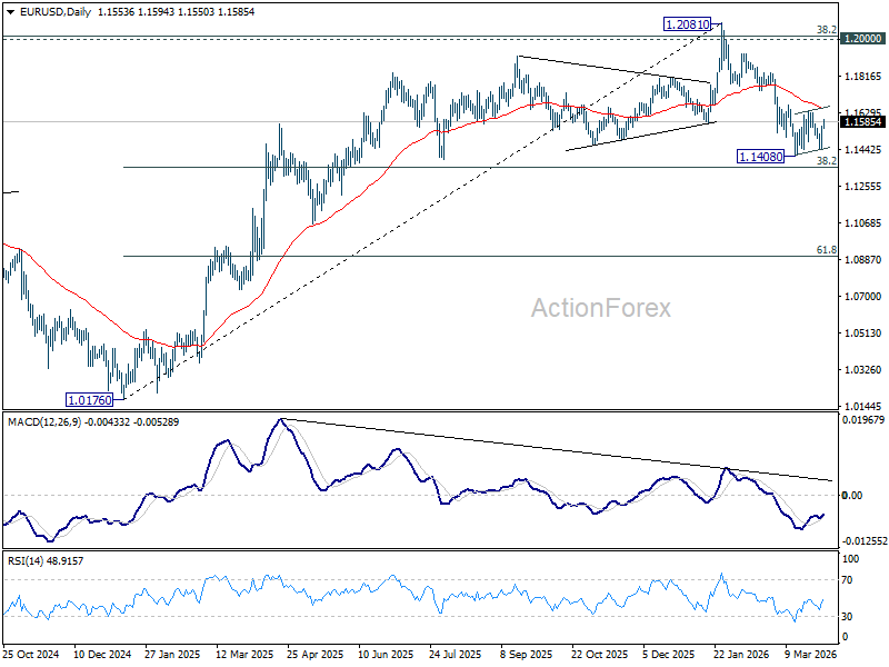 EUR/USD rebounded higher today but it’s still seen as in consolidations from 1.1408. Intraday bias remains neutral, and further decline is expected with 1.1666 cluster resistance (38.2% retracement of 1.2081 to 1.1408 at 1.1665) intact. On the downside, firm break of 1.1408 will resume the fall from 1.2081 to 38.2% retracement of 1.0176 to 1.2081 at 1.1353. However, decisive break of 1.1666 will argue that the fall from 1.2081 has completed, and turn bias back to the upside for 61.8% retracement of 1.2081 to 1.1408 at 1.1824.