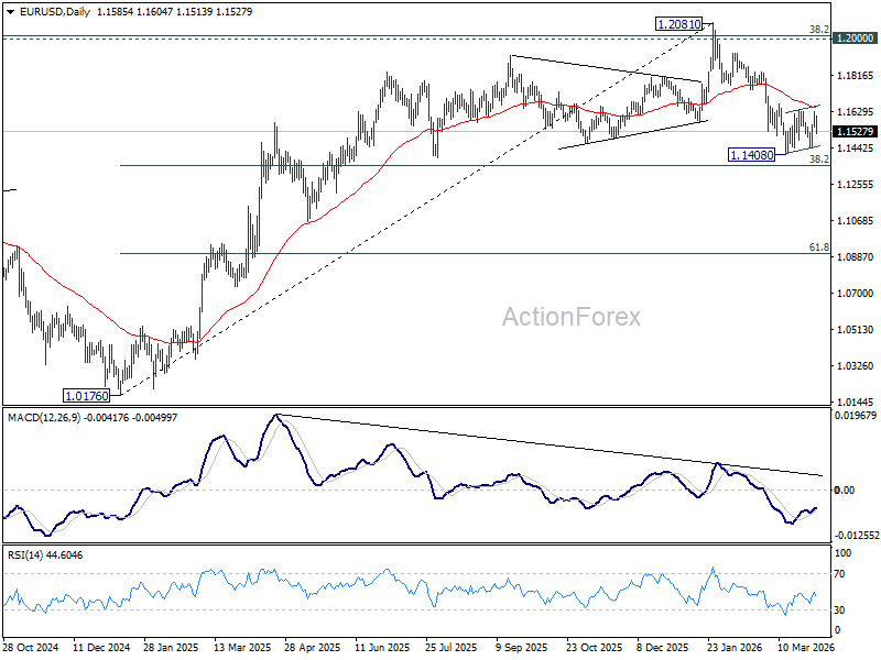 EUR/USD’s rebound stalled at 1.1626 and reversed, but it’s still bounded in established range. Intraday bias stays neutral first. With 1.1666 cluster resistance (38.2% retracement of 1.2081 to 1.1408 at 1.1665) intact, further decline is expected. On the downside, firm break of 1.1408 will resume the fall from 1.2081 to 38.2% retracement of 1.0176 to 1.2081 at 1.1353. However, decisive break of 1.1666 will argue that the fall from 1.2081 has completed, and turn bias back to the upside for 61.8% retracement of 1.2081 to 1.1408 at 1.1824.
