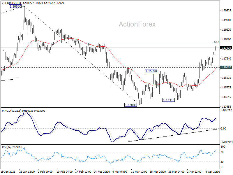 Intraday bias in EUR/USD remains on the upside for 61.8% retracement of 1.2081 to 1.1408 at 1.1824. Decisive break there will extend the rally from 1.1408 to retest 1.2081 high. For now, further rally will remain in favor as long as 1.1662 support holds, in case of retreat.