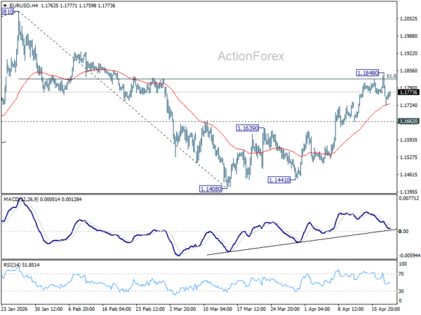 EUR/USD is still extending consolidations below 1.1848 and intraday bias remains neutral. Further rally is in favor as long as 1.1662 support holds. On the upside, sustained trading above 61.8% retracement of 1.2081 to 1.1408 at 1.1824 will pave the way to retest 1.2081 high. However, firm break of 1.1662 support will bring deeper decline back towards 1.1408 low instead.