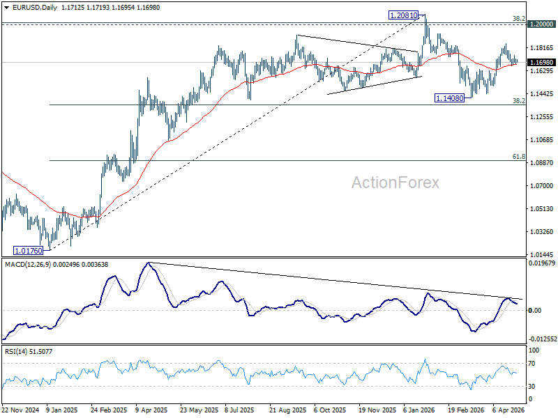 Intraday bias in EUR/USD remains neutral for the moment. Further rally is expected with 1.1662 support intact. On the upside, sustained trading above 61.8% retracement of 1.2081 to 1.1408 at 1.1824 will pave the way to retest 1.2081 high. However, firm break of 1.1662 support will indicate the the rebound from 1.1408 has completed, and bring deeper decline back towards this low instead.
