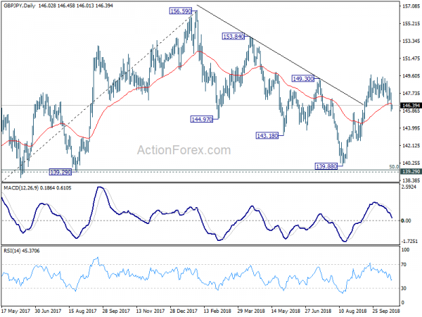 In the bigger picture, current development suggests that GBP/JPY has successfully defended 139.29 cluster support (50% retracement of 122.36 to 156.59 at 139.47). And, the rally from 122.36 (2016 low) is still intact. Such medium to long term rise would extend through 156.96 high. This will now be the preferred case as long as 145.67 near term support holds. However, break of 145.67 will turn focus back to 139.29/47 key support zone.