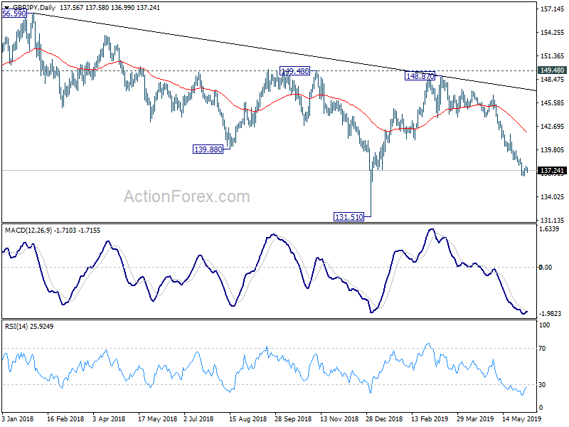 Intraday bias in GBP/JPY remains neutral and more consolidation could be seen above 136.55 short term bottom. Upside of recovery should be limited by 38.2% retracement of 146.50 to 136.55 at 140.35 to bring fall resumption. On the downside, break of 136.55 will turn bias to the downside and extend the fall from 148.87 to 131.51 low.