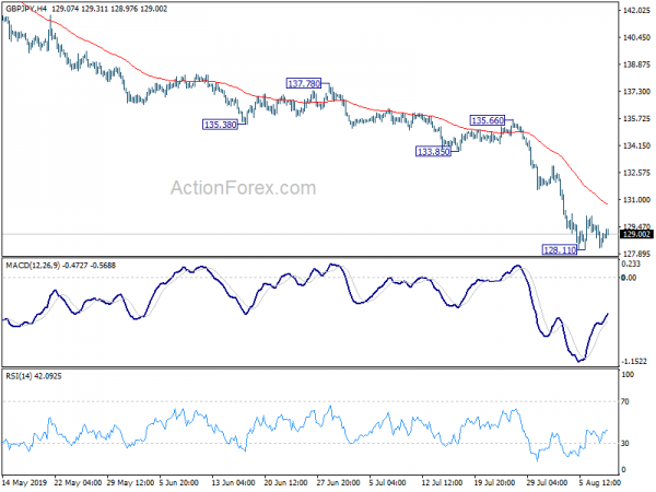 In the bigger picture, outlook remains clearly bearish with GBP/JPY staying well below 55 week and 55 month EMA. Medium term fall from 156.59 (2018 high) is still in progress. Next target is 122.36 (2016 low). We’d be cautious on bottoming there. But break of 135.66 resistance is needed to be the first sign of reversal. Sustained break of 122.36 will target next key level at 116.83 (2011 low).