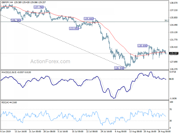 GBP/JPY stayed in consolidation from 126.54 last week and outlook is unchanged. Initial bias remains neutral this week first. On the upside, above 130.69 will bring stronger rebound. But upside should be by 38.2% retracement of 148.87 to 126.54 at 135.07 to bring down trend resumption. On the downside, break of 126.54 will resume larger down trend to 122.61 support next.