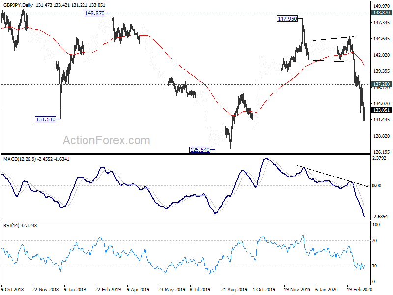 Intraday bias in GBP/JPY remains on the downside at this point. Current fall from 147.95 should target a test on 126.54 low next. On the upside, break of 137.20 resistance, however, will indicate short term bottoming. Stronger rebound could then be seen to 55 day EMA (now at 140.20).